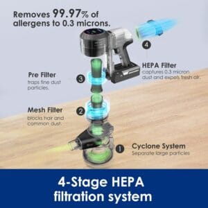- Advanced HEPA Filtration: Traps 99.97% of particles as small as 0.3 microns, including dust, pollen, and allergens. This filter helps keep your air clean, making it ideal for households with pets or allergy sufferers.