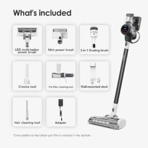 - 3-in-1 tool, long crevice tool, mini motorised tool, and wall mount included